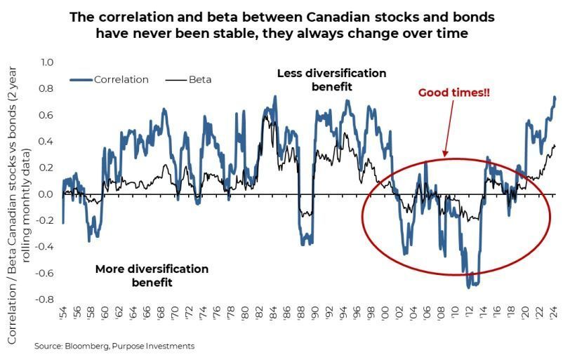 The following chart shows the 2-year monthly correlation between Canadian equities and bonds. It looks rather similar for the U.S. and global markets, but we just thought some Canadian content would be nice. The higher correlation means that, more often, equities and bonds are moving in the same direction. Nobody complains when both are moving higher, like in the past 12 months, but when they move lower together, everyone starts getting grumpy, like in 2022. The 2nd line, beta, measures not just the direction of the two asset classes but the magnitude of the relative move.