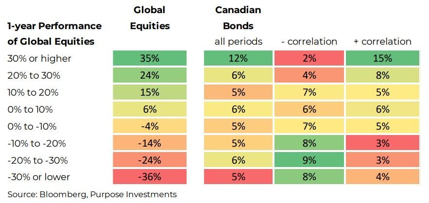 Here is a good lens. Using data back to the 1950s, we looked at the one-year returns for global equities and broke them down into return range buckets. Truthfully, who cares what their bonds are doing when stocks are up 20 or 30%? But we do care much more when stocks are down -20 or -30%. More impactful – bond returns were further split from periods with negative bond/equity correlations and those with a positive correlation (last two columns).