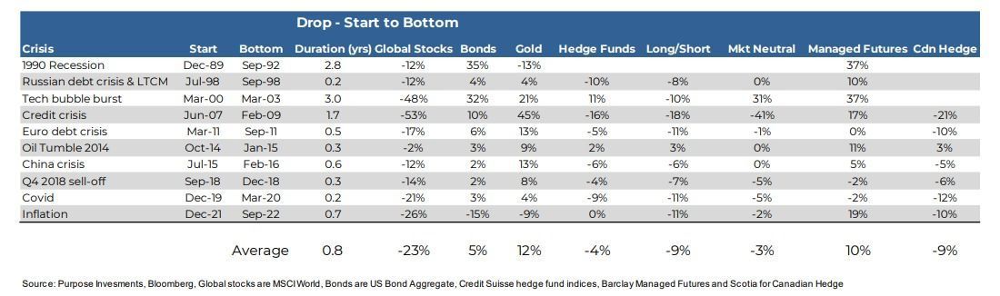 Another useful lens is ‘Crisis Alpha.’ This is looking at an asset class or strategy’s performance during periods of stress in the market. Could be a short-term correction or a longer-term bear market. If you can add value during these periods, or at least stability, that has positive attributes for portfolio construction.