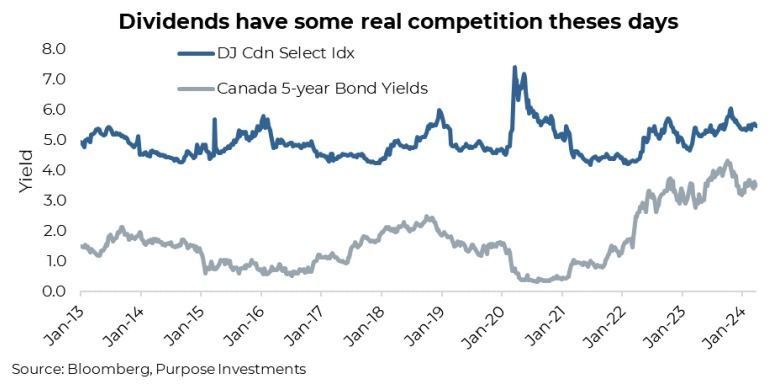 The dividend space has clearly become rather challenging over the past year, given higher bond yields. But it isn’t just bond yields. The increased popularity of other sources of yield has certainly risen over the past number of years, from the structured notes space to covered call strategies that are being applied to just about anything with a live option chain. The search for yield has never had so many choices. So what could turn this tide and help the performance of dividend payers close that gap with the broader market? We’re not sure; maybe a broad market sell-off that cools the more aggressive risk-on behaviour. Maybe central bank rate cuts or lower bond yields. Or maybe just the realization that buying operating companies with decently safe dividends in the 5-7% range and attractive valuations offers a good risk/reward combination and a decent income stream as you wait out this dividend depression.