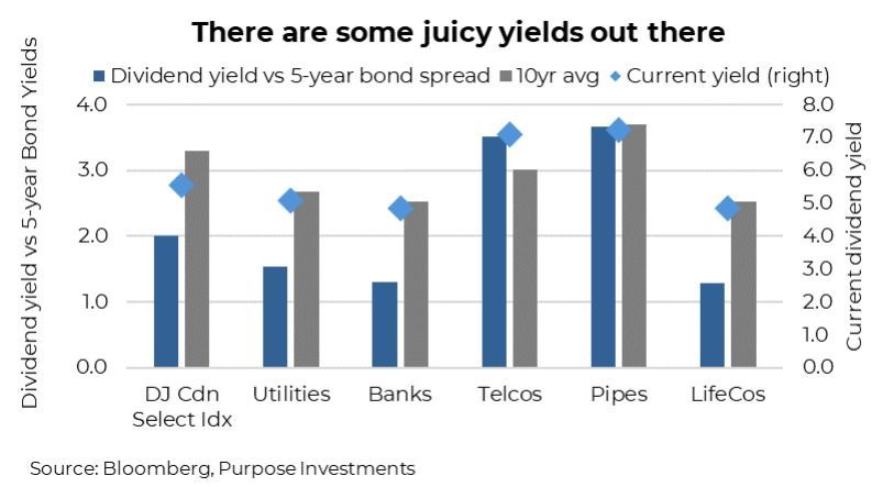 Yet, while the overall DJ Canadian Select Index dividend yield may not look overly enticing compared to bond yields (above chart), digging into specific sectors does show a different picture. The chart below shows the current dividend yield across various dividend-heavy sectors compared to the five-year government of Canada bond yields, plus the 10-year average spread and the nominal dividend yield. The overall dividend space may not be hugely enticing on a relative yield basis, but telcos and pipes sure are, each yielding about 7%.