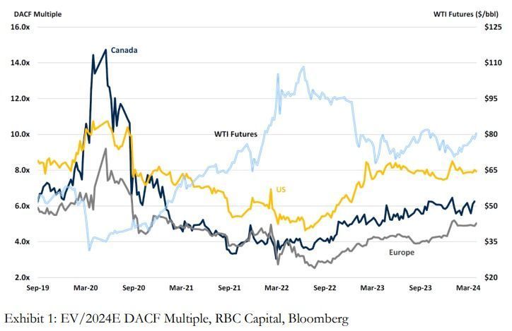 To determine if the oil equities are overstretched, we can look at the debt-adjusted cash flow (DACF) multiples of the major integrated oil names and see how the valuation has shifted in light of the recent oil move. From Exhibit 1, the DACF multiples for the Canadian integrated have been fairly range-bound over the last year, also in line with WTI, which has been in the $70 - $85 range. As a starting point, we can infer that the valuations of the companies have been commensurate with the movements in the underlying oil price deck and in line with where the equities should trade in the cycle historically over the last couple of years. Typically, in the commodities cycle, higher prices are usually coupled with lower multiples as market participants will usually price in lower normalized prices and vice versa, so a cause of concern would be if valuation starts trending towards the 6.5x – 7.0x+ area if oil prices continue to stay in the upper bounds of the $70 - $90 range or higher.