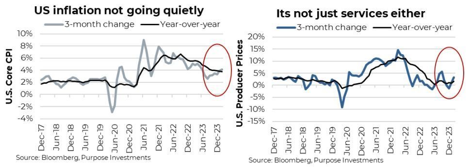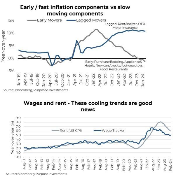 Despite goods inflation ticking up of late, investors should not read too much into this as it tends to be more volatile. More importantly, the lagged inflation components are starting to roll over. The two biggest drivers of services inflation, rents and wages, are cooling. Small business wage and price intentions are softening. This should help inflation continue to cool as 2024 progresses, albeit not in a straight line that can include some countertrend moves, like the one happening right now.