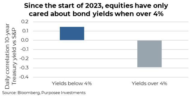 More importantly, for today, any variation in the path of inflation can quickly translate into bond yields. The recent CPI and PPI prints triggered the 10-year U.S. Treasury yield to move up from about 4% to 4.3%. That may not sound like a big deal, but over the past year or so, the equity market has been very sensitive to bond yields when above 4%. What does that mean? Well, when bond yields have been below 4% since the start of 2023, there has been a weak relationship between the movement in bond yields and the stock market. However, when it was over 4%, this relationship became much stronger and more reliable.
