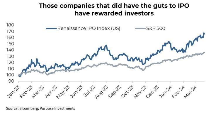 Maybe the Reddit IPO will become infections and inject some optimism for those waiting to hit the market. Or maybe the new highs of markets will help. Or stabilizing of bond yields. There is likely a lot of pent-up demand for raising capital or doing deals or going public. Another factor that may encourage an end of this IPO drought is performance of those that had the guts to IPO. The Renaissance IPO index tracks the performance of IPOs for two years. A bumpier road yet IPOs have certainly been beating the broader market. Maybe the deal drought is coming to an end.
