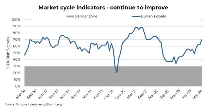 The improved economic data has been picked up in our Market Cycle framework, potentially alleviating broader near-term recession risk. The Market Cycle is comprised of over 40 indicators, all of which have historically had some efficacy in showing turning points in the economic cycle. Some signals are from the bond market, U.S. or global economic data, some from sentiment, fundamentals, etc. The view is that not ever signal works in each cycle, so we have a diversified approach with many signals.