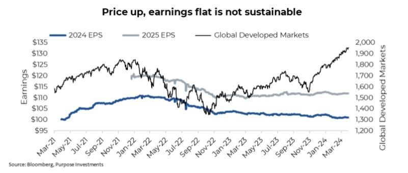 Earnings are a concern. If the economy were truly improving, why has this not translated into earnings forecasts? The chart below is global developed markets and headline consensus earnings estimates for 2024 and 2025. Earnings revisions and the market often move in tandem. Yet over the past year, we have seen market up and earnings flat, which means this is almost all multiple expansion.