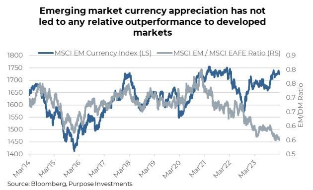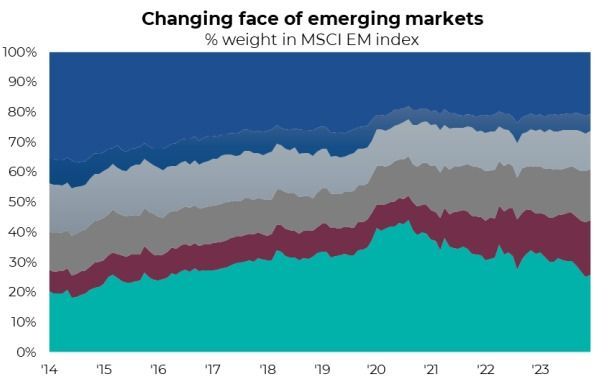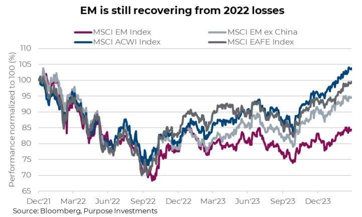 Central bank pivot: After a period of tightening liquidity, central banks in developed economies are nearing an inflection point, potentially shifting towards rate cuts in mid-2024. This shift from monetary tightening to easing typically benefits emerging markets. It can help stimulate global growth, and with inflation falling, financial markets are stabilizing. In addition, many emerging markets have already begun their easing cycles as inflation measures across emerging markets continue to trend lower thanks to lower commodity prices and support from currency appreciation and tighter monetary policy.