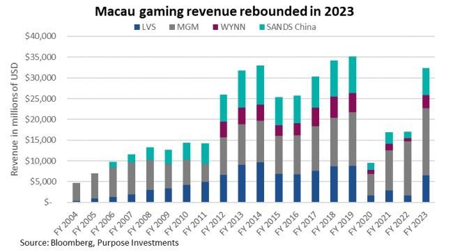 But this is beginning to change. While the Chinese consumer may not be buying Chanel handbags or iPhones at quite the same pace, gaming revenues in Macau have rebounded nearly back to 2019 levels. This is a positive development. Good spending may still be hampered, but experiential spending is healthy. Chinese air travel has already recovered and will likely extend its growth in 2024.